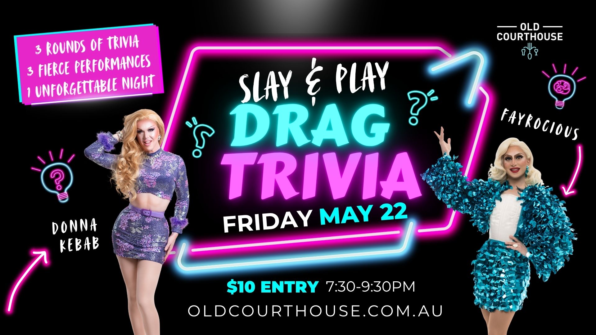 Trivia queens, it’s time to put your knowledge to the test—get ready to werk your answers and sashay into victory! Your hosts – Fay Rocious and Donna Kebab, bring the bling for Drag Trivia at the Old Courthouse. These nights are famous for being outrageously popular and an absolute blast! Expect a whole lotta laughs, serious brain busters and fabulous company as you slay and play the night away during this raucous and risqué evening.