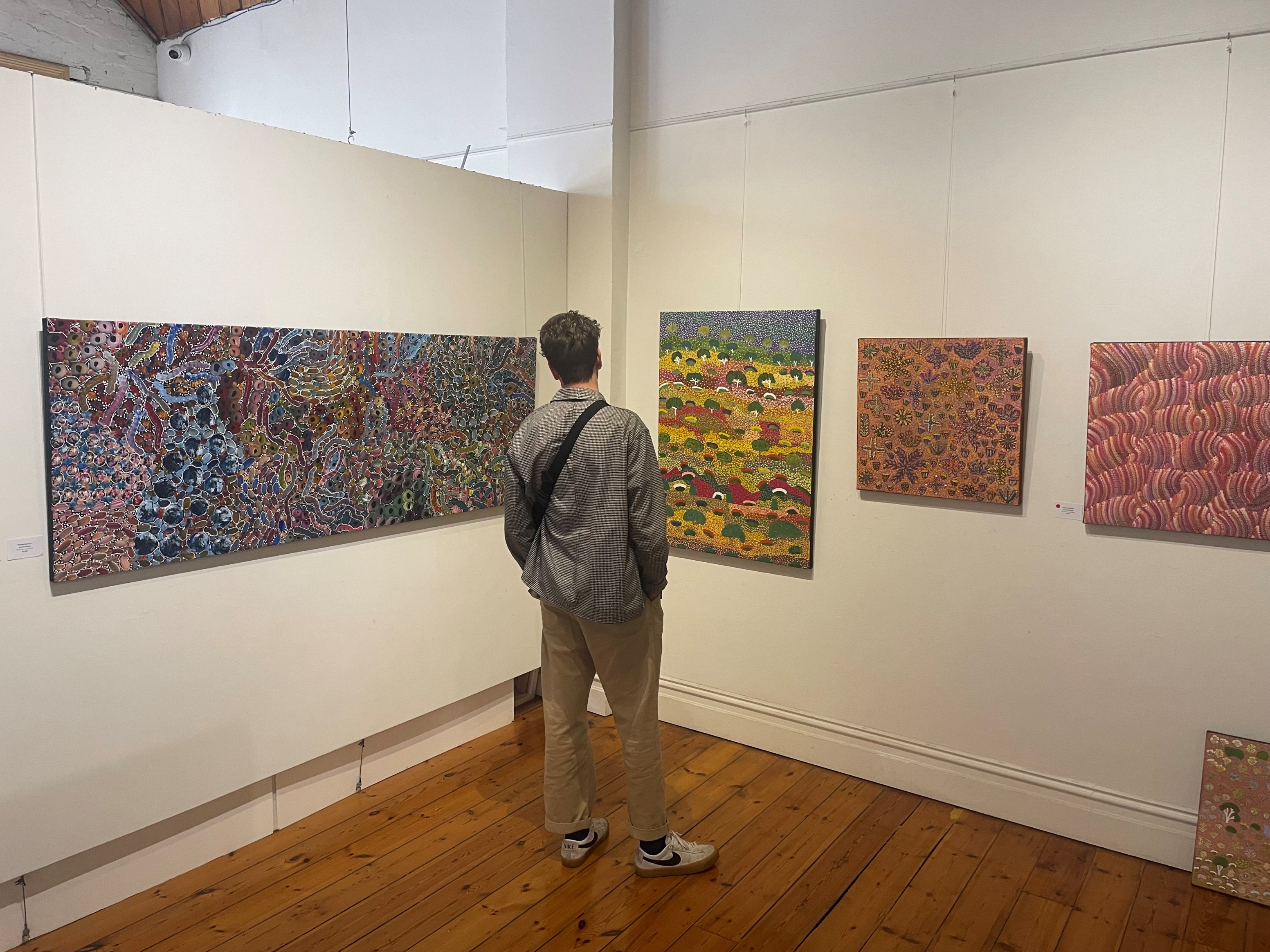 The artists apply their stories to their canvases to describe the cultural and regional qualities of their homelands. Utopia artists Rita Pula Loy creates the rolling sandhill patterns of Central Australia and Dora Mbitjana combines traditional women’s body painting motifs into her work. Rachael Nambula includes images of the bush yam as does Eileen Bird Kngwarreye and Joy Petyarre. Other exhibiting artists include Nellie Marks Nakamarra, Jeannie Mills Pwerle, Belinda Golder Kngwarreye and Freda Price Pwerle amongst others.