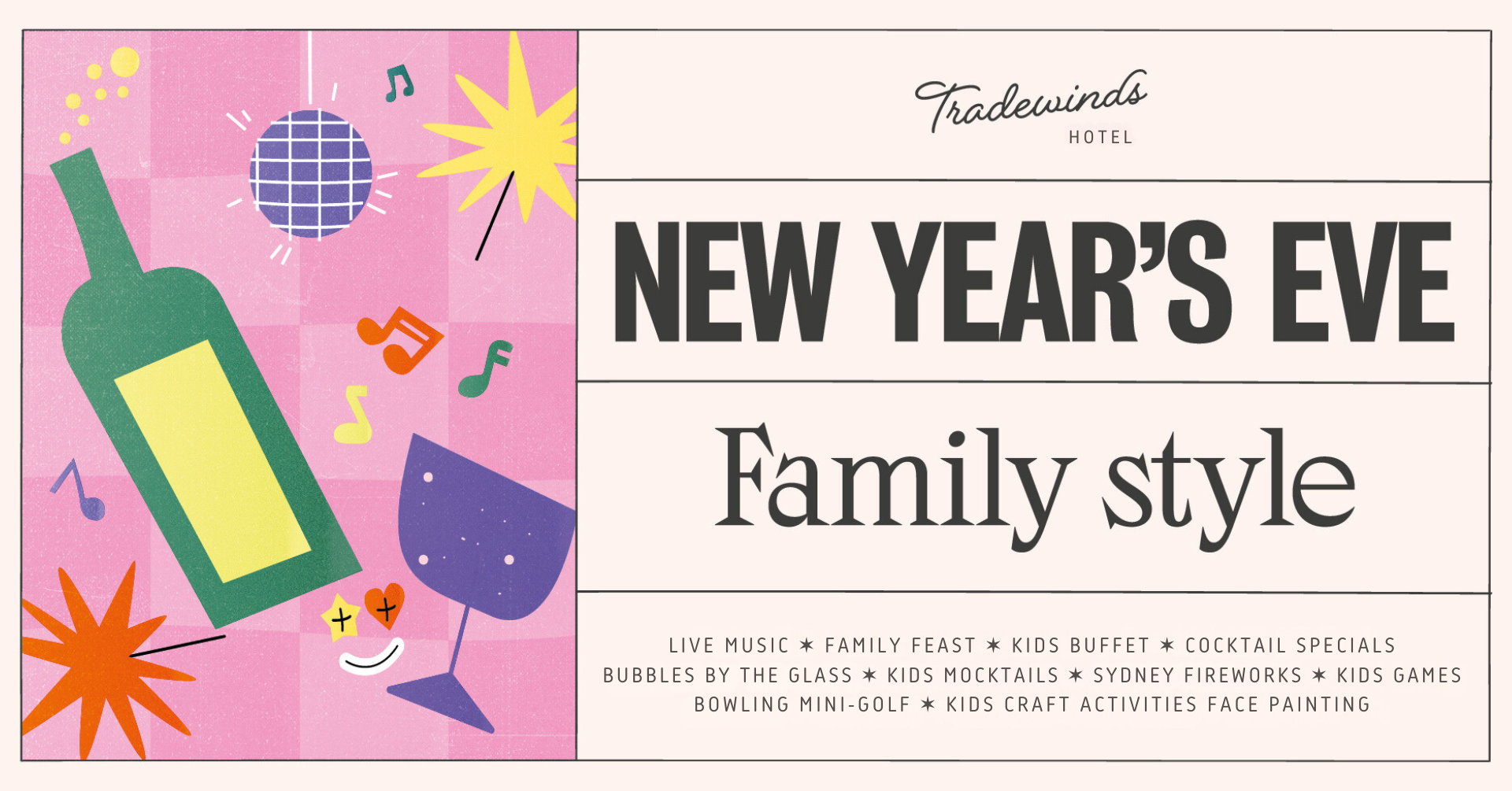 For the Adults: $99 per person Enjoy a mouthwatering feast featuring the freshest seasonal produce, as you toast to the New Year with a glass of bubbles or specialty cocktail. Champagne, sparkling wine and cocktails starting from $19.